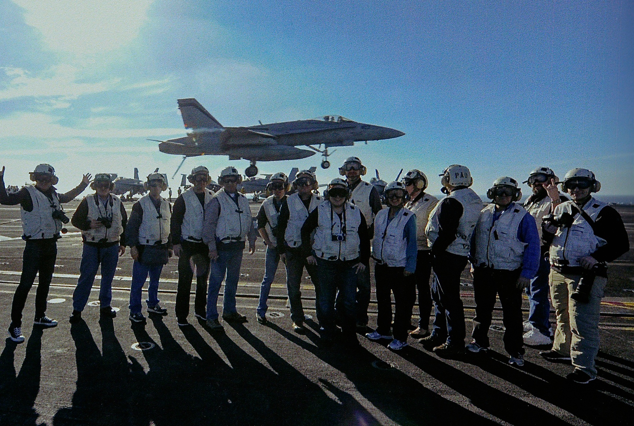 We stood there, cameras clicking, smiles widening and bones vibrating as $67,000,000 state of the science, 51,000 pound jets landed and catapulted off the 4.5 acre deck, far closer than I would have expected but still, there was a magic line and none of us dared cross it. We were just on the stern side of the “Junkyard” where a few SeaHawk helicopters, an AWACs plane and some forklift like machines were parked.  Our plane had landed less than 30 minutes prior and we already had sustenance, assurance and recognition and were closer to live carrier flight operations than 99.99% of people on the entire planet ever get…and we had more, much more coming.